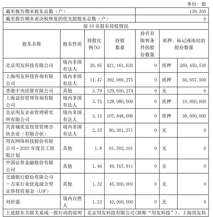 北京用友企业管理研究所有限公司持股3.15%,共青城优富投资管理合伙企业(有限合伙)持股2.35%,用友网络科技股份有限公司-2023年度员工持股计划持股1.8%;