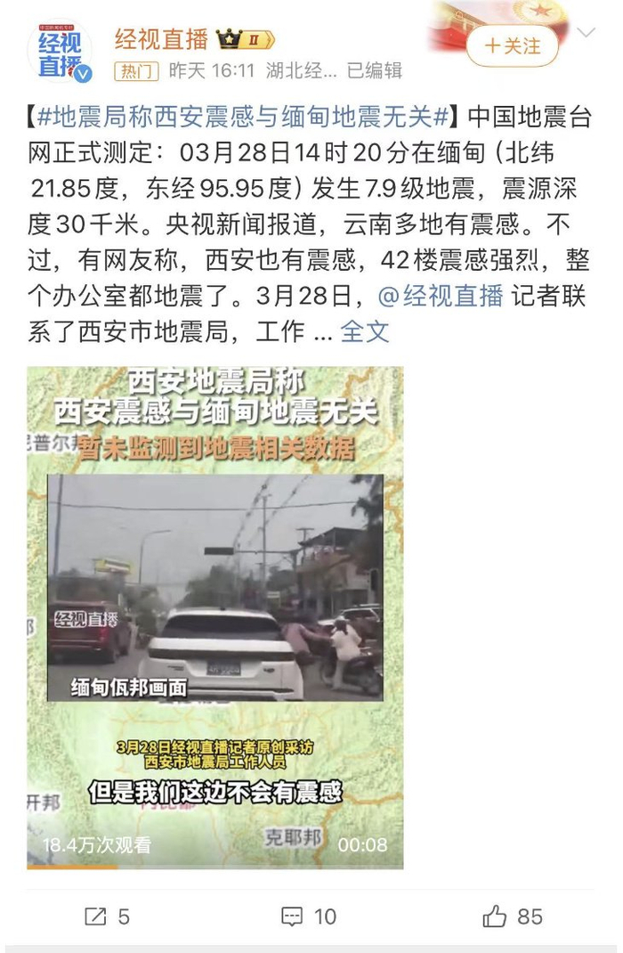 缅甸地震后,有网友发帖称,在西安都有震感。随后西安市地震局辟谣,表示暂未监测到地震相关数据。地震期间,网上各类谣言四起,大家注意分辨,以官方信息为准。