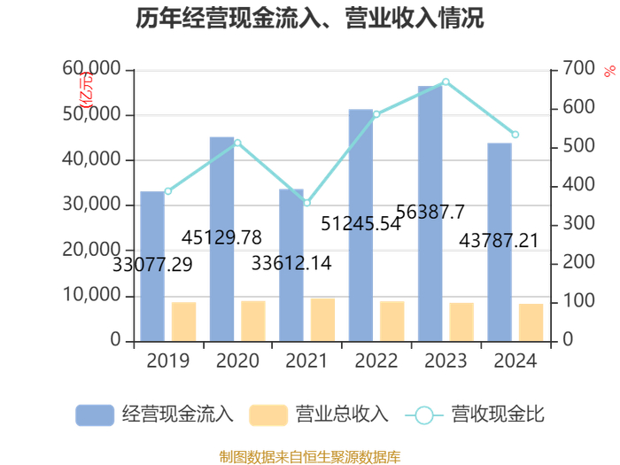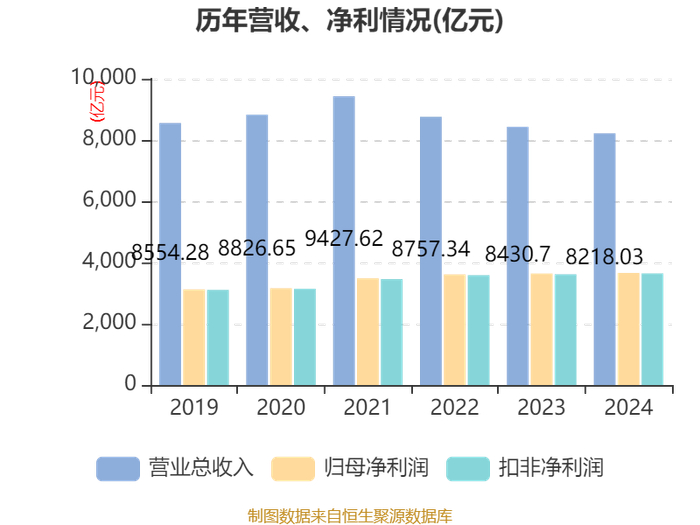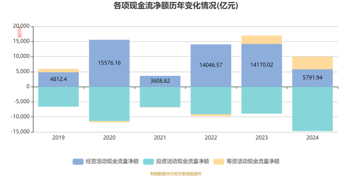截至2024年,公司经营活动现金流净额为5791.94亿元,同比下降59.13%;筹资活动现金流净额4156.83亿元,同比增加1302.39亿元;投资活动现金流净额-14714.68亿元,上年同期为-8918.52亿元。