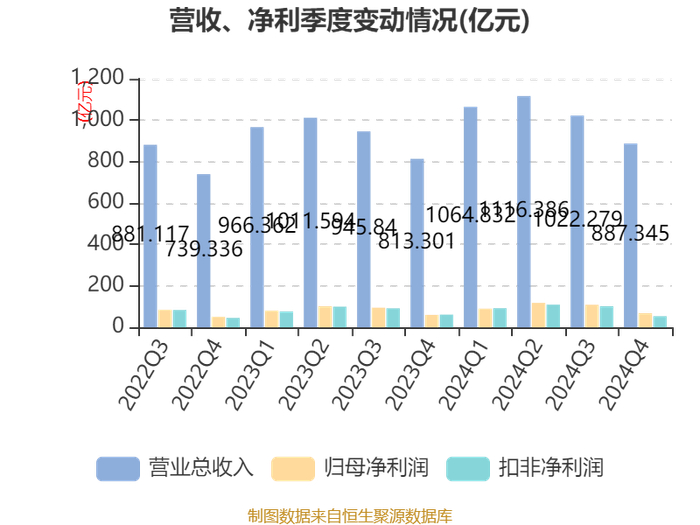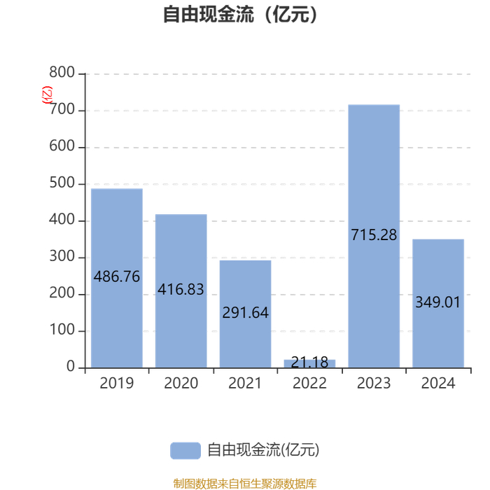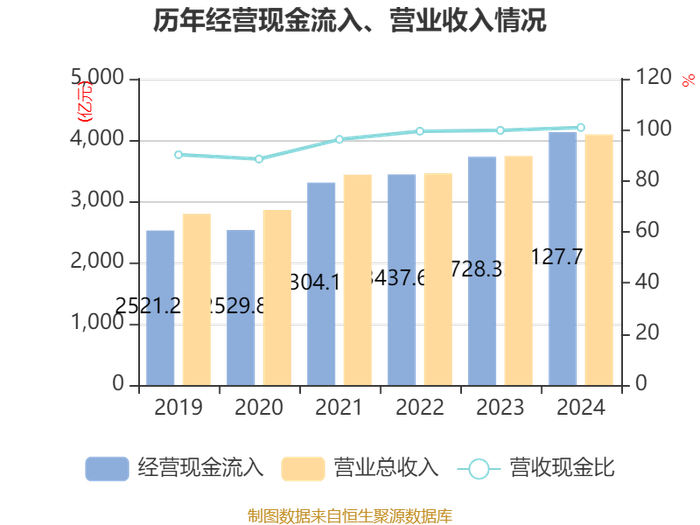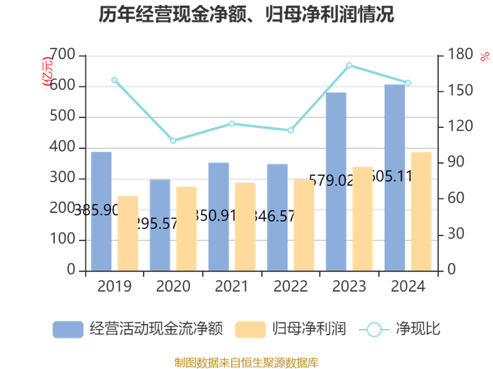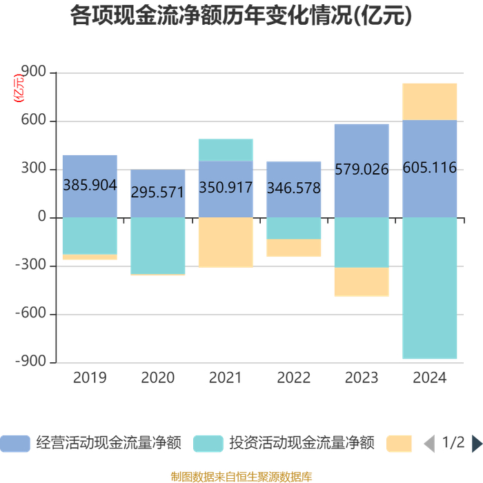 截至2024年,公司经营活动现金流净额为605.12亿元,同比增长4.51%;筹资活动现金流净额226.98亿元,同比增加406.08亿元;投资活动现金流净额-879.02亿元,上年同期为-312.2亿元。