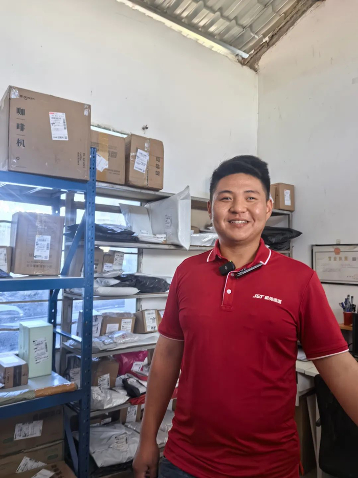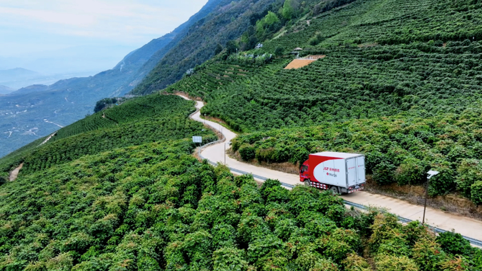 在新寨村海拔1100米的咖啡庄园里,咖农段会志正将烘焙好的咖啡豆装入印有“极兔速递”字样的快递箱。“以前寄快递要翻山路去镇上,现在极兔在村里设了揽收点,早上打包,两天就能到上海客户手里。”