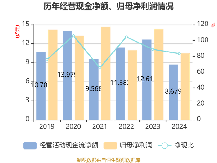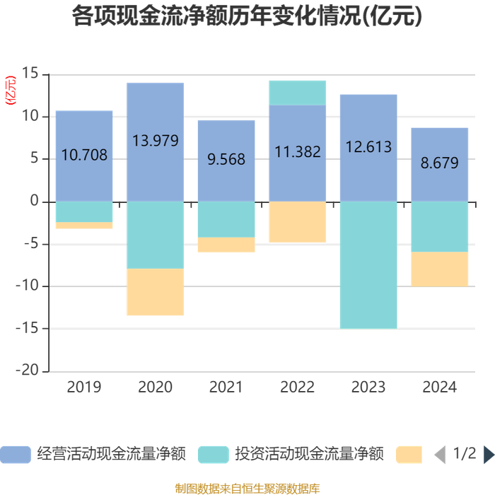 截至2024年,公司经营活动现金流净额为8.68亿元,同比下降31.19%;筹资活动现金流净额-4.08亿元,同比减少4.05亿元;投资活动现金流净额-5.95亿元,上年同期为-15.03亿元。