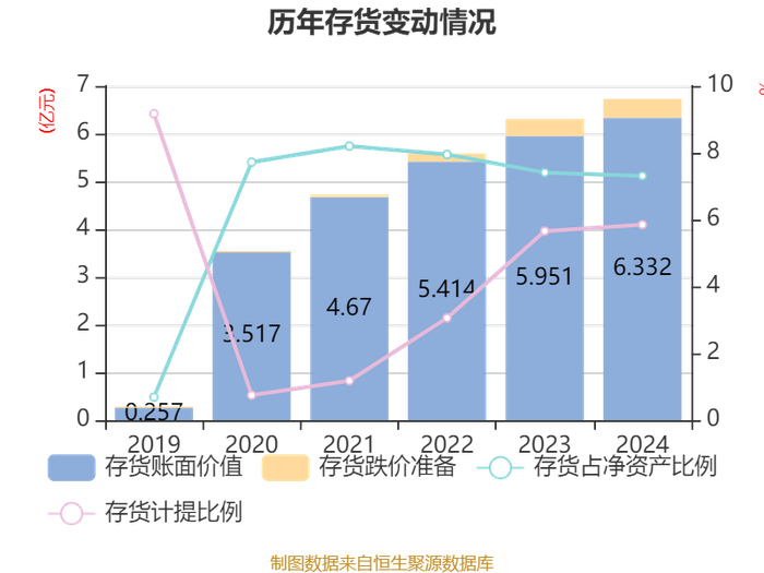 从存货变动来看,截至2024年末,公司存货账面价值为6.33亿元,占净资产的7.31%,较上年末增加3807.45万元。其中,存货跌价准备为3936.53万元,计提比例为5.85%。