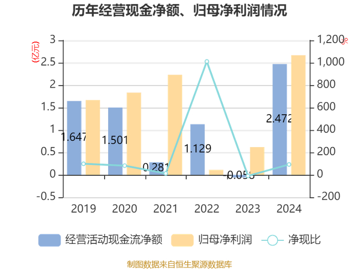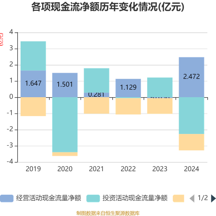 截至2024年,公司经营活动现金流净额为2.47亿元,同比增加2.53亿元;筹资活动现金流净额-1.01亿元,同比减少401.84万元;投资活动现金流净额-2.27亿元,上年同期为1.21亿元。