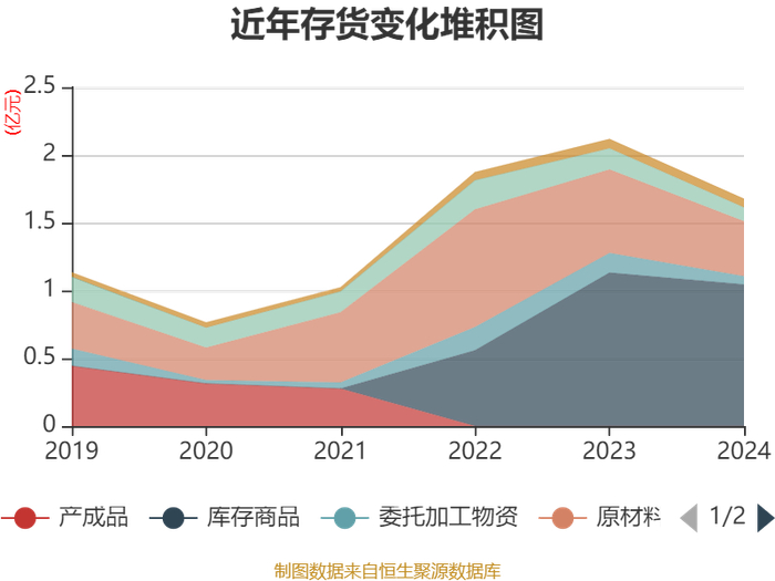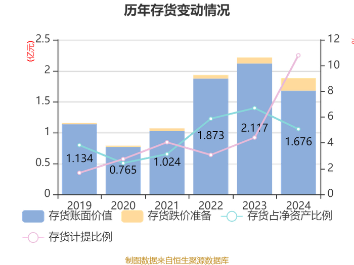 从存货变动来看,截至2024年末,公司存货账面价值为1.68亿元,占净资产的5.06%,较上年末减少4410.23万元。其中,存货跌价准备为2027.88万元,计提比例为10.79%。