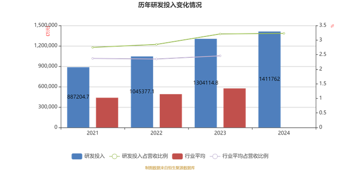 2024年全年,公司研发投入金额为141.18亿元,同比增长8.25%;研发投入占营业收入比例为3.23%,相比上年同期上升0.02个百分点。此外,公司全年研发投入资本化率为0.96%。