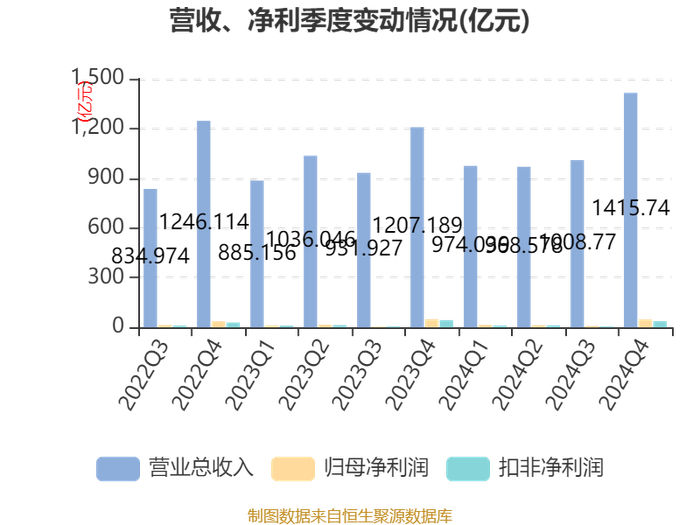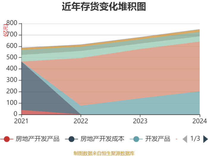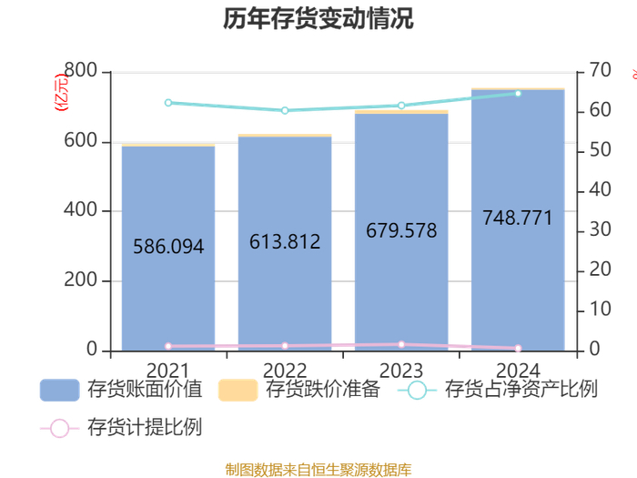 从存货变动来看,截至2024年末,公司存货账面价值为748.77亿元,占净资产的64.54%,较上年末增加69.19亿元。其中,存货跌价准备为4.4亿元,计提比例为0.58%。