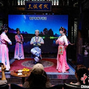 中国农历“三月三”前夕,广西桂林市靖江王府城墙脚下的正阳东西巷历史文化街区,一座修旧如旧、青砖灰瓦的民国时期合院式城市民居内,一台沉浸式歌舞剧、刘三姐经典秀《三姐有戏》开演,吸引了来自北京、江苏等地游客落座戏厅,一边品恭城油茶,一边观看这台极具地方特色的歌舞剧。