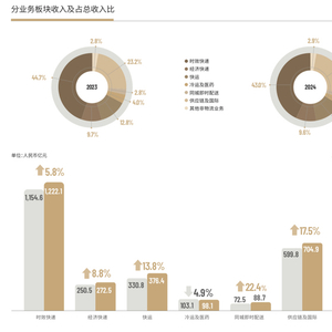 其次是快运业务,2024年这一板块的收入同比增长13.79%至376.41亿元,经济快递收入同比增长8.78%至272.51亿元,冷运及医药业务同比下降4.86%至98.12亿元,同城即时配送业务同比增长22.39%至88.73亿元,其他非物流业务同比增长11.85%至81.44%。
