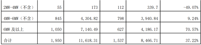 2024年,公司实现风电机组销售收入180.53亿元。实现对外销售容量11618.31MW,同比上升37.22%。
