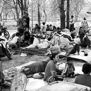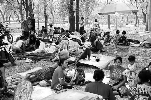 曼德勒受灾民众在户外避险。