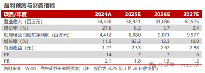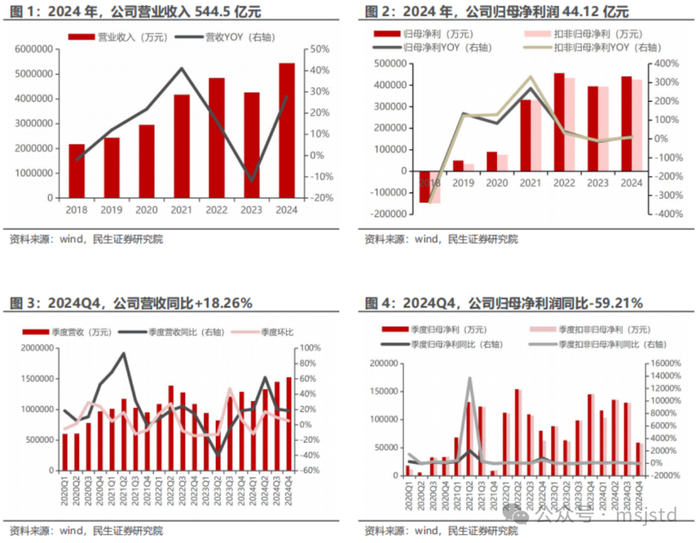 公司发布2024年年报:2024年,公司实现归母净利润44.12亿元,同比+11.52%;扣非归母净利润42.58亿元,同比+8.34%。单季度看,2024Q4归母净利5.92亿元,同比-59.21%,环比-54.52%;扣非归母净利5.76亿元,同比-60.45%,环比-55.51%。