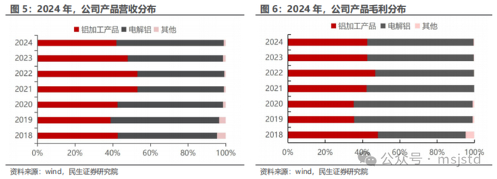 营收方面,受电解铝产量上升及铝价走强影响,2024年公司电解铝营收309.75亿元,同比+43.43%,占总营收56.89%;铝加工产品营收228.42亿元,同比+11.93%,占总营收比41.95%;其他产品营收6.33亿元,同比-4.82%,占营收比重1.16%。