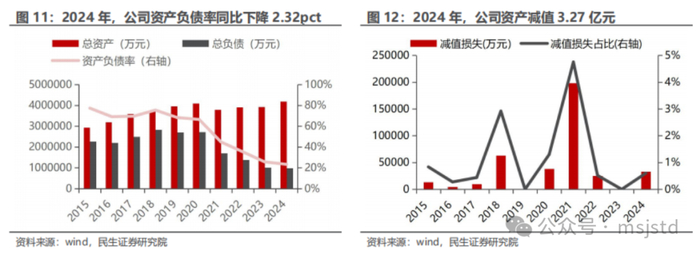 资产负债表进一步优化。2024年末公司短期借款降至0,长期借款降至23.65亿元,2024年公司资产负债率低至23.28%,同比下降2.32pct。2024年公司减值损失3.27亿元,主要在四季度体现,减值主要是文山铝业旗下西畴矿业分公司提供洗选服务的资产计提相关资产减值。