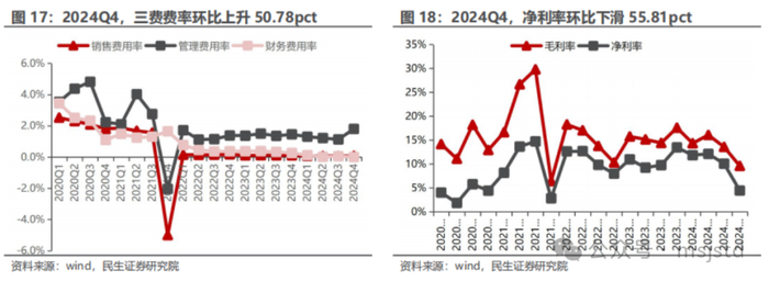 2024Q4毛利率环比下滑3.98pct,同比下滑7.99pct。2024Q4公司毛利率、净利率为9.60%和4.45%,环比分别下滑3.98pct、5.62pct。