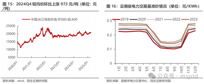 量:2024年原铝产量293.83万吨,同比+53.8万吨,主要是2024年限产较少导致;氧化铝产量140.88万吨,同比-2万吨。单季度看,24Q4电解铝产量79万吨,环比略下降;氧化铝33.6万吨,环比-1.5万吨。