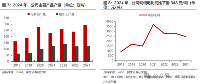 ◾2024年电解铝产量大幅增长。量:2024年原铝产量293.83万吨,同比+53.8万吨,主要是2024年限产较少导致;氧化铝产量140.88万吨,同比-2万吨。2025年,公司生产经营目标:氧化铝产量141万吨,电解铝产量301万吨。价:2024年铝价19922元/吨,同比+1222元/吨,氧化铝价格4034元/吨,同比+1134元/吨,预焙阳极均价4389元/吨,同比-1478元/吨。虽然铝价上涨,但由于氧化铝价格强势,公司单吨盈利略下滑,测算2024年公司吨铝毛利2453元,同比-348元/吨。