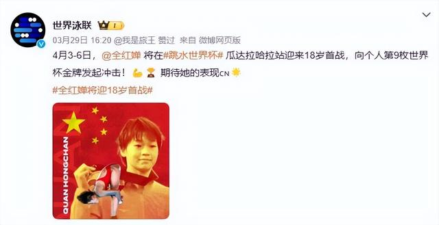 29日,@世界泳联 发文称:4月3-6日,全红婵将在跳水世界杯瓜达拉哈拉站迎来18岁首战,向个人第9枚世界杯金牌发起冲击!期待她的表现。