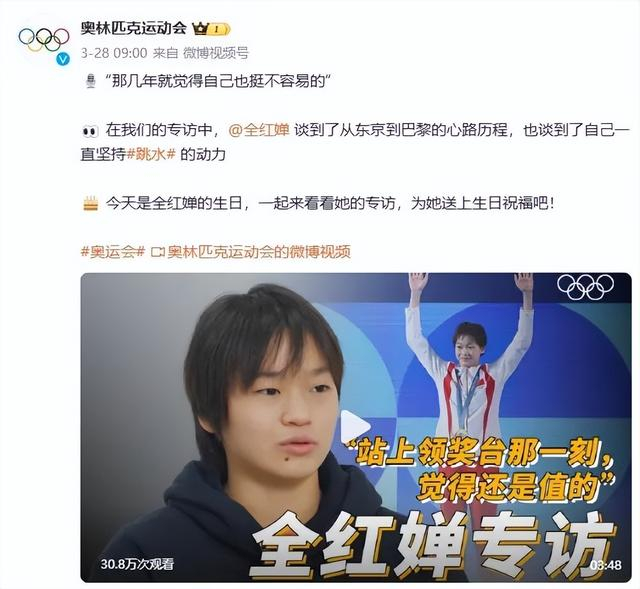 国际奥委会也发视频为全红婵庆生:“在我们的专访中,@全红婵谈到了从东京到巴黎的心路历程,也谈到了自己一直坚持跳水的动力。今天是全红婵的生日,一起来看看她的专访,为她送上生日祝福吧!”
