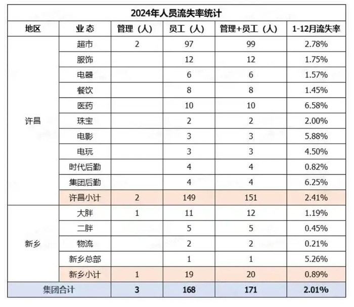 2024年,胖东来集团共流失了171人,人员流失率为2.01%。