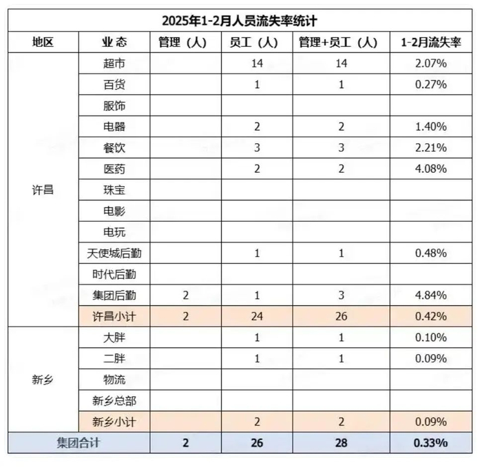 2025年1~2月,胖东来集团共流失了28人,其中包括2名管理人员及26名员工,人员流失率为0.33%。
