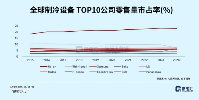 实际上,在少有人关注的角落,欧睿国际数据显示,2024年海尔全球大型家用电器品牌零售量第一,海外市场份额达到53%,登上全球家电王座。