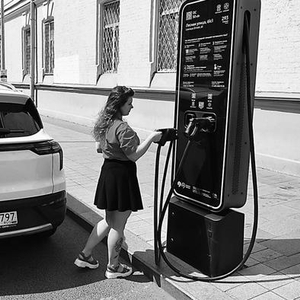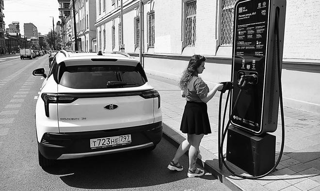 莫斯科,一名女孩正在给“莫斯科人-3e”电动车充电。