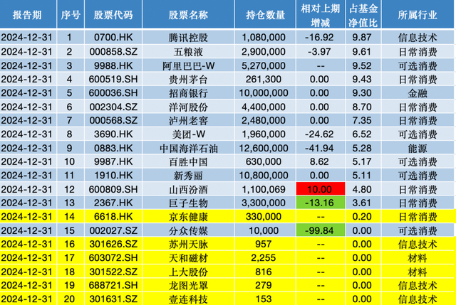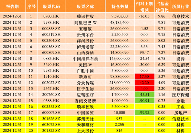 据此前披露的2024年四季报,在前十大重仓股中,该基金减持了中国海洋石油(0883.HK)、美团(3690.HK)腾讯控股(0700.HK)、五粮液(000858);阿里巴巴(9988.HK)获张坤增持。