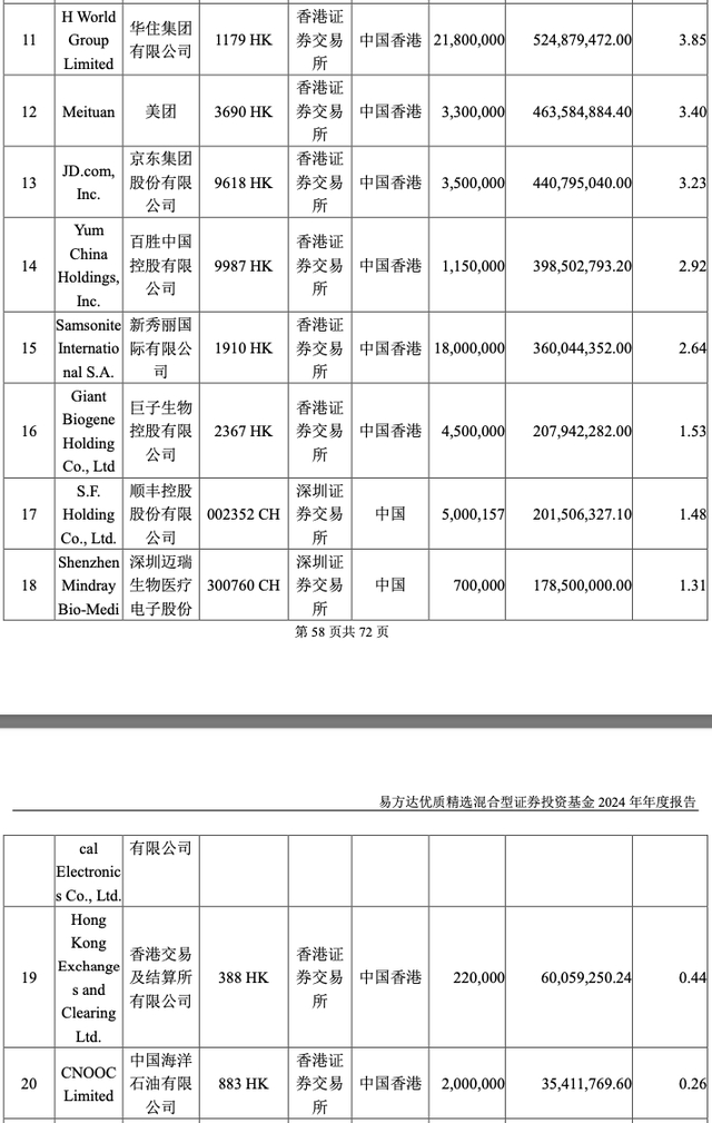 易方达优质企业三年持有2024下半年前二十大重仓股