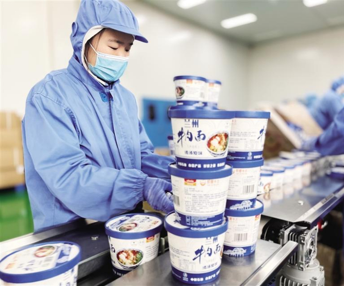 走进兰州树屏食品产业园的“蘭啵旺”智能化生产基地,只见工人们站在大锅前,搅拌查看着用牛肉、牛骨和各式香料熬成的牛肉汤。一袋袋封装好的牛肉拉面预包装产品,经过了严苛而精细的生产加工流程和层层质检后,工作人员将传送带上的拉面产品一一打包、装箱,码放在指定区域。“我们在源头把控、食材精选、加工制作的各个环节精益求精,加强技术创新,提升智能制造水平,以现代食品工业技术优化还原,做到产品有标准、可溯源、真还原。”甘肃陇萃堂营养保健食品股份有限公司副总裁兼首席执行官王小伟介绍说。