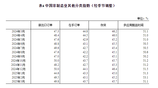供应商配送时间指数为50.3%,比上月下降0.7个百分点,仍高于临界点,表明制造业原材料供应商交货时间持续加快。