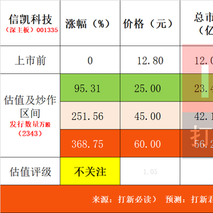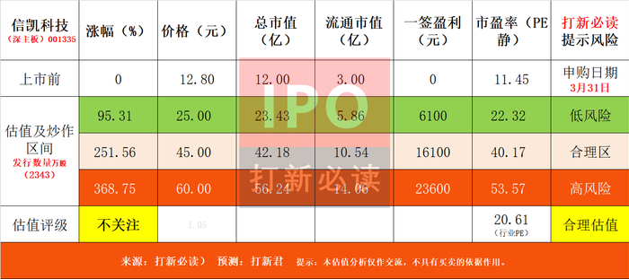 【预测表格说明】:中间淡黄色为打新君预测首日可能的合理价格,绿色为未来低风险区间【特别注意:对于质地不错的公司,绿色 9 价格预期,这需要看当时的市场环境变化)。全面注册制后,合理、高、低风险区间表示前五天可能面临的价格,其中低风险区预示价值凸显,高风险区间为炒作风险区间;而随着注册制时间越久,高低风险价格越来越趋向未来的一段时间的价格,而合理价格更具有新股溢价问题的指引作用。$信凯科技(001335)