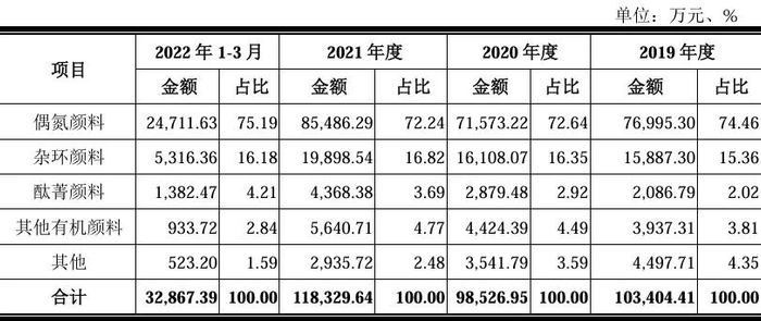 偶氮颜料:占主营业务收入67.42%,耐光性优异,成本较低;