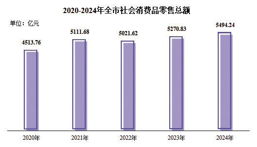 全年社会消费品零售总额5494.24亿元,比上年增长4.2%。按经营地统计,城镇消费品零售额5167.74亿元,增长4.0%;乡村消费品零售额326.50亿元,增长8.9%。按消费类型统计,商品零售额4868.74亿元,增长4.3%;餐饮收入625.50亿元,增长4.1%。