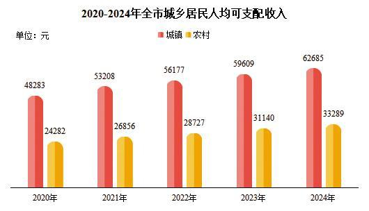 全年常住居民人均可支配收入55832元,比上年增长6.2%。其中,工资性收入33393元,增长6.8%;经营净收入8109元,增长6.6%;财产净收入4375元,增长3.8%;转移净收入9956元,增长4.9%。按常住地分,城镇常住居民人均可支配收入62685元,比上年增长5.2%;农村常住居民人均可支配收入33289元,增长6.9%。城乡居民人均可支配收入比值为1.88,比上年缩小0.03。全市居民人均消费支出32442元,比上年增长6.0%。按常住地分,城镇居民人均消费支出36135元,增长5.1%;农村居民人均消费支出20293元,增长6.8%。