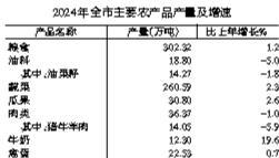 全年粮食总产量302.32万吨,比上年增长1.2%。其中,夏粮62.12万吨,增长1.5%;早稻21.09万吨,下降1.5%;秋粮219.11万吨,增长1.4%。蔬菜产量260.59万吨,增长2.3%。瓜果产量30.80万吨,增长2.6%。油料产量18.80万吨,下降5.0%。