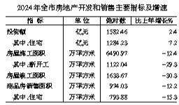 全年房地产开发投资1582.46亿元,比上年增长2.4%;其中住宅投资1284.23亿元,增长7.2%。新建商品房销售面积974.03万平方米,下降12.2%。