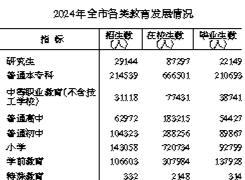 年末全市各类高等院校59所(含成人高校、不含军事院校),其中研究生培养院校9所。全年研究生教育招生2.91万人,在校研究生8.73万人,毕业生2.21万人。普通本专科招生21.45万人,在校生66.65万人,毕业生21.07万人。中等职业教育学校(不含技工学校)47所,在校生7.74万人。普通高中99所,在校生18.32万人,高中阶段毛入学率107.66%。普通初中219所,在校生28.83万人,初中阶段毛入学率110.07%。小学417所,在校生72.07万人,小学毛入学率111.06%。幼儿园1507所,在园幼儿30.80万人。全市义务教育经费保障机制改革惠及学生100.90万人,其中城市42.79万人、农村58.11万人。