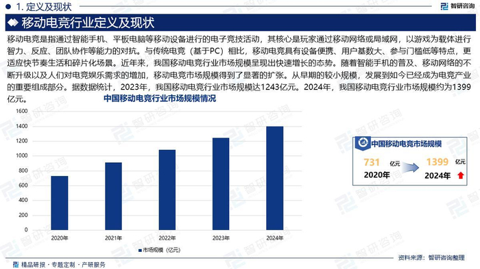 移动电竞是指通过智能手机、平板电脑等移动设备进行的电子竞技活动,其核心是玩家通过移动网络或局域网,以游戏为载体进行智力、反应、团队协作等能力的对抗。与传统电竞(基于PC)相比,移动电竞具有设备便携、用户基数大、参与门槛低等特点,更适应快节奏生活和碎片化场景。近年来,我国移动电竞行业市场规模呈现出快速增长的态势。随着智能手机的普及、移动网络的不断升级以及人们对电竞娱乐需求的增加,移动电竞市场规模得到了显著的扩张。从早期的较小规模,发展到如今已经成为电竞产业的重要组成部分。据数据统计,2023年,我国移动电竞行业市场规模达1243亿元。2024年,我国移动电竞行业市场规模约为1399亿元。