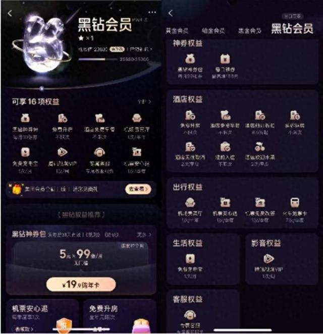 据了解,一期权益主要包括“神券”权益、酒店权益(免费升房、免费早餐、折扣预订)、出行权益(机场贵宾厅、机票退改礼包、火车抢票卡)、生活权益(免费充电宝、影音VIP)等。美团黑钻会员覆盖无限次酒店免费升房及免费早餐、专属客服等一系列权益。
