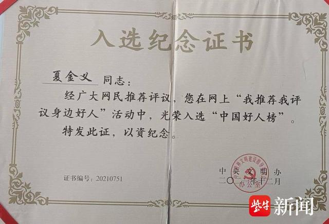 因为一直热心公益,夏金义多年来无私付出,他也以后先后被评为江苏好人、中国好人。扬子晚报/紫牛新闻记者 高峰