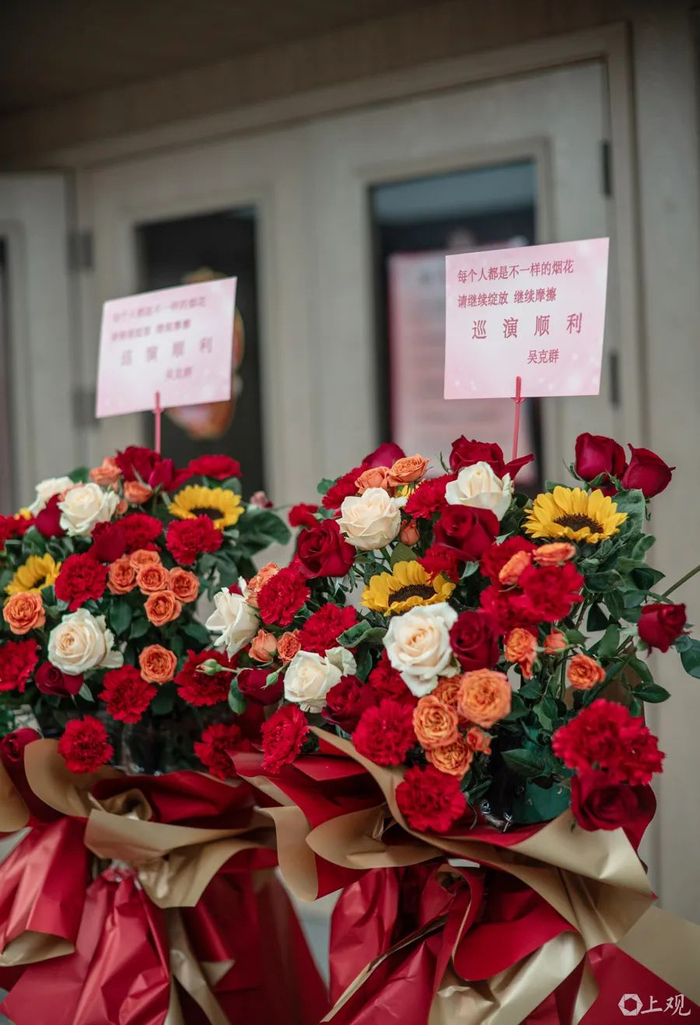 新歌空间门口摆了两只色彩灿烂的大花篮,祝贺的卡片上写着:“每个人都是不一样的烟花,请继续绽放,继续摩擦,巡演顺利。”落款处是“吴克群”。等待入场的观众们议论纷纷:“是那个吴克群吗?”