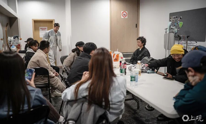 记者们悄声交流着下午采访的素材,经纪人热络地和网红聊着流量、商业运营的玩法,庞麦郎十指紧扣,略显拘谨地坐在一群城市打工人中。