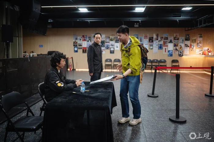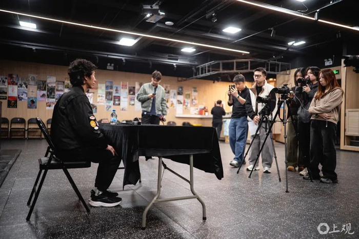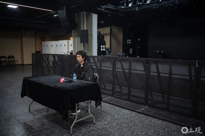 记者会就安排在新歌空间的观众区。一张盖着黑色绒布的桌子,桌上摆着一瓶水,几支不同家媒体的话筒录音笔,庞麦郎坐在大桌子前,双手拘谨地放在大腿上,显得身形更加瘦弱。记者们与他对面而立。