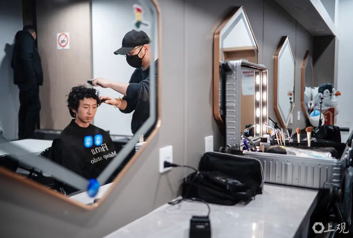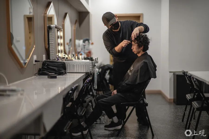 3月28日下午,新歌空间休息室,身材干瘦的庞麦郎穿着一件黑色的棒球服坐在化妆镜前。造型师把他的头发一撮一撮捻起来,烫卷。很快,原本服贴在头皮上的直发变成了时髦的羊毛卷,朴素的庞麦郎有了舞台感。