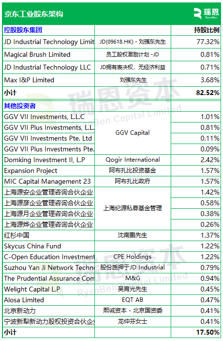 招股书显示,京东工业,其在上市前的股东架构中,刘强东先生,通过京东集团(09618.HK,JD.NASDAQ)、Max I&P Limited等实体,合计控制约82.52%的投票权。