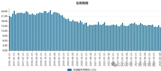 目前顺丰快递单票价格下降速度仍然很快。2025年,顺丰的降价策略仍在延续。2025年2月顺丰的单票价格已低至14.35元,同比下降11.9%,相较于2019年下降了10元。令人担忧的地方在于,在目前的交通运输框架下,快递物流的效率已接近极致,今年顺丰的降本空间还能有多大?