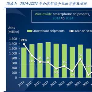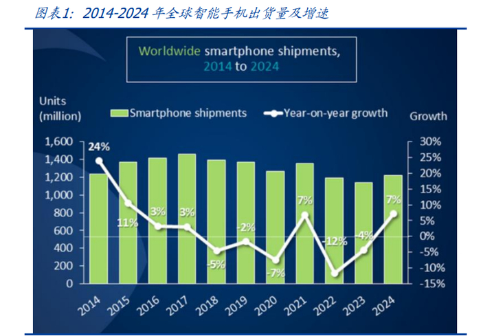 智能手机市场景气度回升,换机需求逐渐释放。根据 Canalys,2024 年全球智能手机出 货量为 12.2 亿部,同比增长了 7%,实现连续两年下滑后的反弹。在中国智能手机市场, 根据 IDC,24Q4 由于各价位段新品的集中上市,以及部分省市开始的新机购买补贴政策 推动整体市场延续了之前 4 个季度的增长趋势,出货量约 7643 万台,同比增长 3.9%; 2024 全年中国智能手机出货量约 2.86 亿台,同比增长 5.6%。我们认为,随着 AI 端侧 落地开启新一轮换机周期,以及在 2025 年全国性政府消费补贴政策的刺激下,智能手 机市场需求将进一步提升。