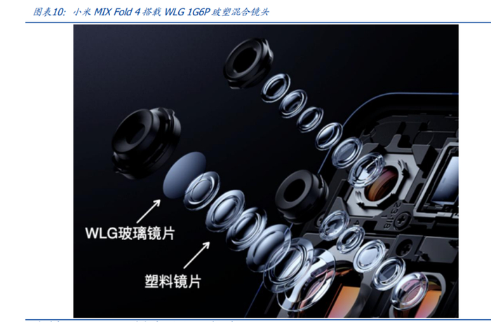 玻塑混合逐渐兴起,模组空间得以缩小。 通过引入光学性能更优、厚度更薄的玻璃镜片,玻塑混合镜片在提升整体镜头性能的同 时有效降低镜头厚度。塑料镜片在工艺难度、量产难度、成本等方面具有优势,目前旗 舰手机镜头大多由 6-7 片纯塑料镜片构成。一般搭载的镜片数量越多,镜头的成像效果 越好,但发展到 7P、8P 塑料镜头几乎是极限,因为镜头模组过于厚重,且光学性能无法 大幅提升。为追求更好的光学性能,现在手机主摄多采用大面积影像传感器,但传感器 面积越大,法兰距就越长,镜头就会越凸,违背手机轻薄化趋势,因此,改善镜片的材 质来实现在光学性能和设计结构上的突破,玻塑混合镜片应运而生。相比传统塑料镜头, 玻塑混合镜头具有更大光圈、高解析力、低厚度、低温漂等优点。 玻塑混合被苹果、华为、小米、OPPO、vivo、荣耀等主流品牌采用,舜宇光学、辰瑞 光学、欧菲光和联创电子均有布局。2023 年发布的小米 MIX Fold 3,为首款采用玻塑混 合镜头的折叠屏手机;2024 年发布的小米 MIX Fold 4,主摄继续沿用了一颗 1G6P WLG 晶圆级玻塑混合镜头,由瑞声科技旗下的辰瑞光学供应。1G6P 是指 1G((1 片玻璃镜片) +6P((6 片塑料镜片)的组合方案,超薄高透 WLG 玻璃镜片的引入,将有效提升镜头的 进光量,解析力也更高,影像效果更为优异。