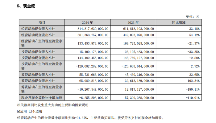 需要指出的是,2024年,比亚迪现金及现金等价物净增加额为-62.55亿元,与上年同期57.33亿元相比相差约120亿元;公司经营活动产生的现金流量净额为1334.54亿元,与上年同期1697.25亿元相比下降21.37%。